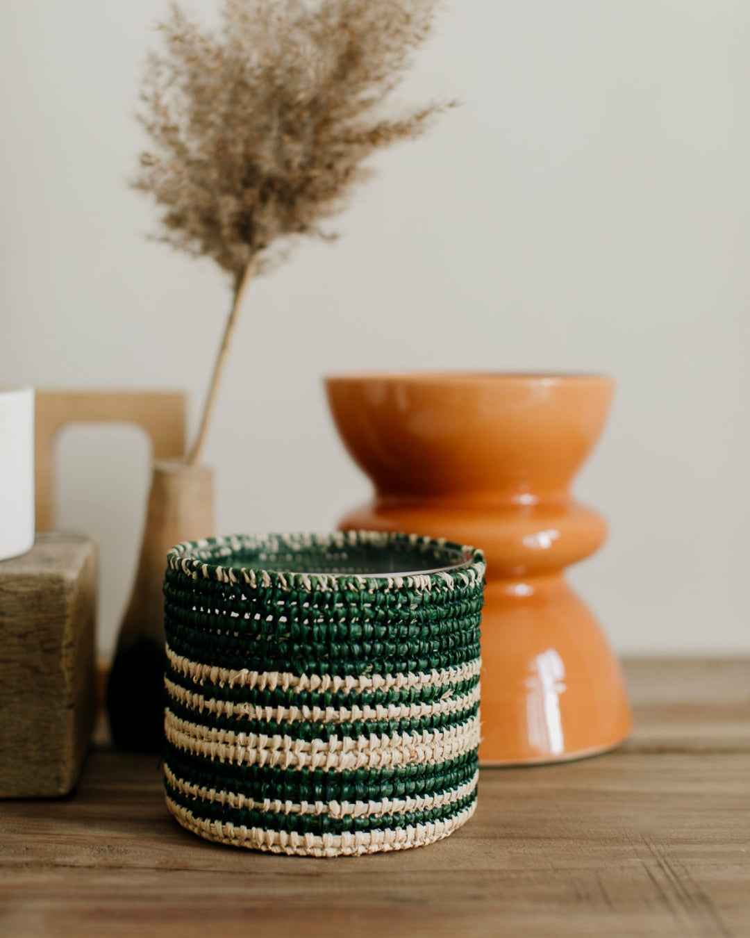 - Elegancka osłonka - wykonana ze szkła, ozdobiona dwukolorową rafią, która dodaje subtelnego i przytulnego uroku.